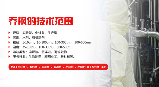 上海喬楓實業(yè)有限公司,成立于2012年,是從事噴霧干燥設(shè)備的研發(fā)設(shè)計、生產(chǎn)、銷售(小型噴霧干燥機(jī),實驗型噴霧干燥機(jī),35℃低溫噴霧干燥機(jī),有機(jī)溶劑噴霧干燥機(jī),低溫閉式循環(huán)噴霧干燥機(jī)、超細(xì)粉末噴霧干燥機(jī)、噴霧冷凍干燥機(jī)、真空噴霧干燥機(jī)、氣流噴霧干燥機(jī),噴霧造粒干燥機(jī),離心噴霧干燥機(jī),沸騰制粒機(jī)等)和售后于一體的綜合性公司,本公司現(xiàn)成為一家致力于為生物制藥、精細(xì)化工、新能源、陶瓷造粒及食品工程等領(lǐng)域提供全套解決方案的整線交鑰匙工程企業(yè)。